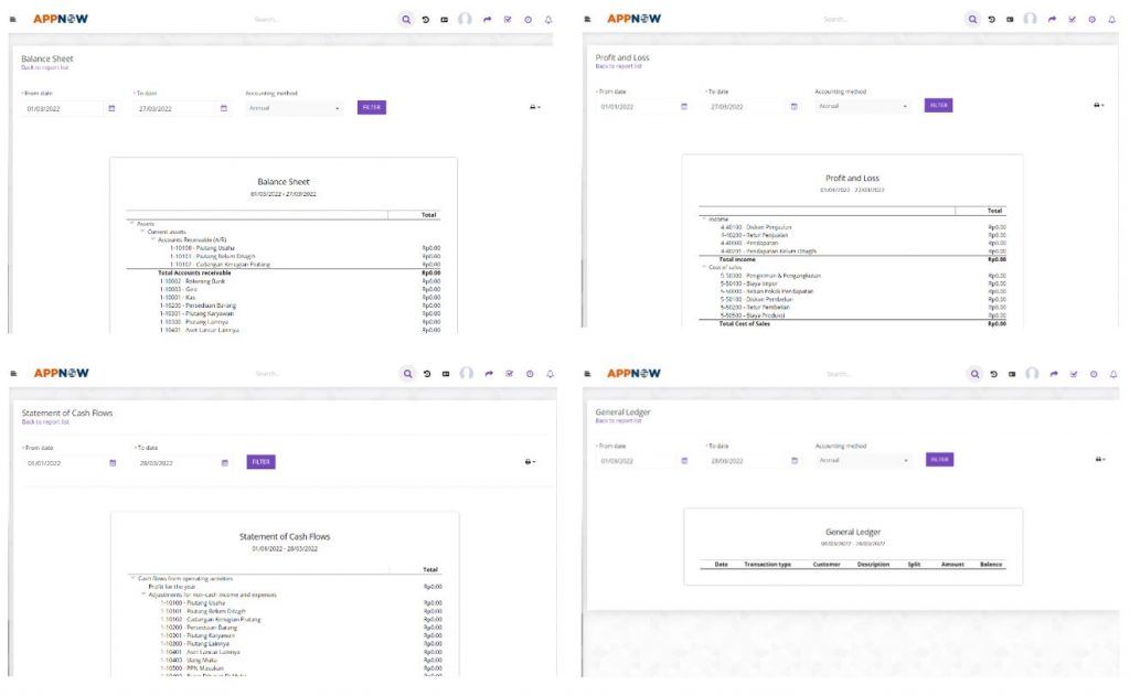 Berisi berbagai laporan yang ter-integrasi sesuai dengan module yang tersedia mulai dari module: OKR, ACCOUNTING, HUMAN RESOURCES, PAYROLL, TIMESHEET & LEAVE, LEAD, CUSTOMER, POINT OF SALES – RETAIL, SALES, COMMISSIONS, PROJECTS, TASKS, PURCHASE, INVENTORY, ASSETS, EXPENSES, SUPPORT & TICKETING