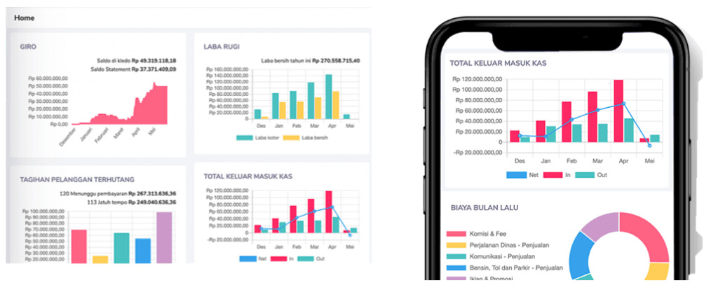 Lihat pengeluaran usahamu, produk paling laris, laba rugi, dan saldo bank dalam bentuk grafik cantik dari dashboard.